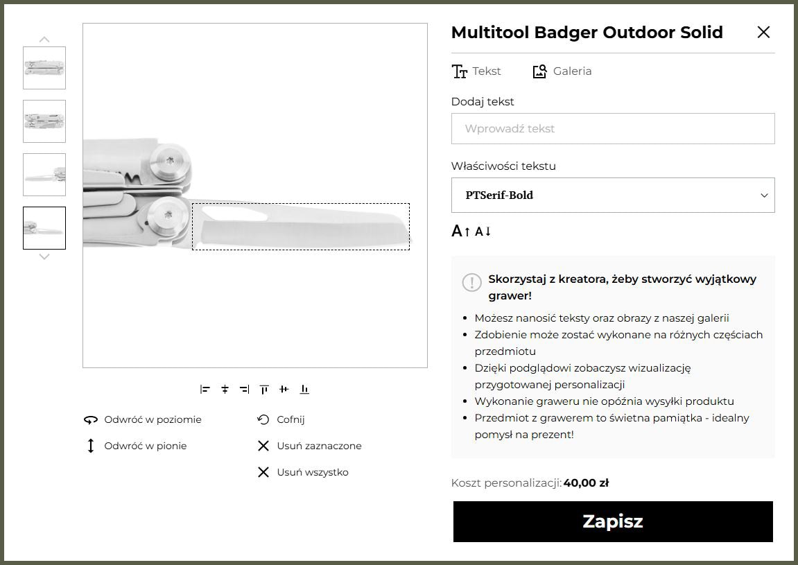 - umieszczać elementy w dostępnych polach grawerunku (od 1 do 4 - w zależności od produktu).