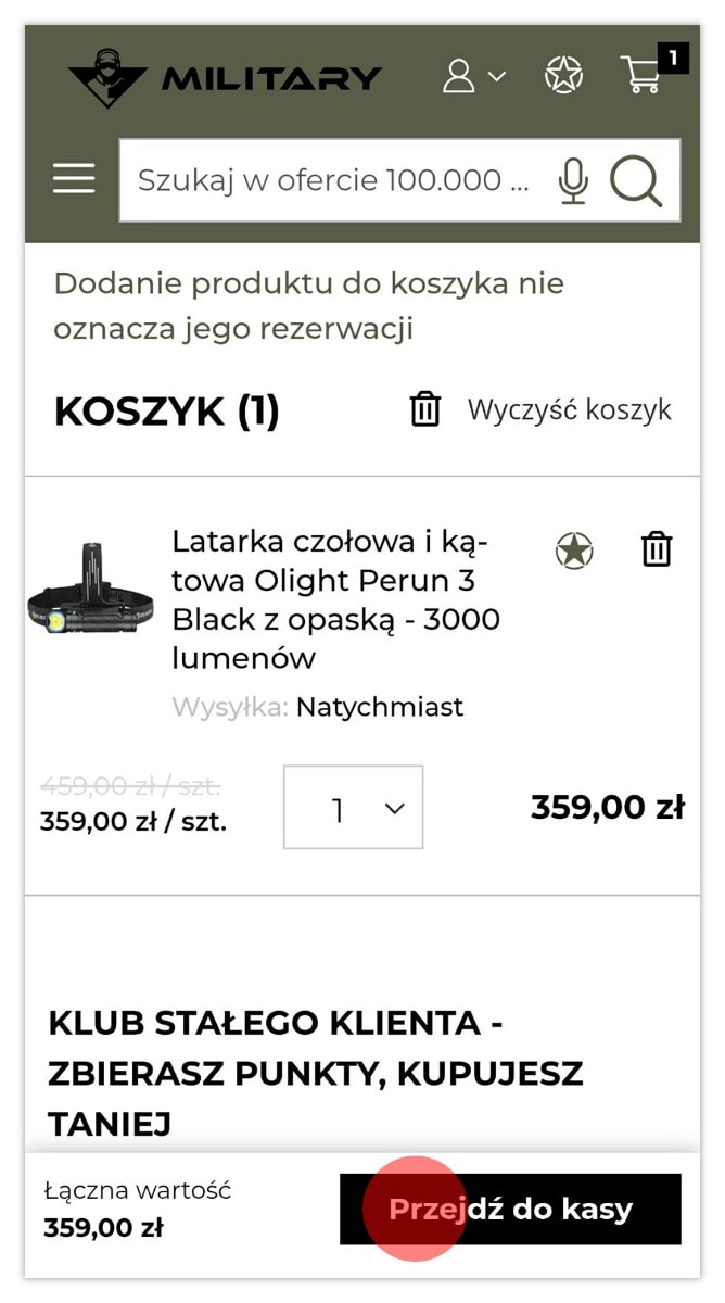 - Kliknij ikonę koszyka, a następnie przycisk PRZEJDŹ DO KASY.