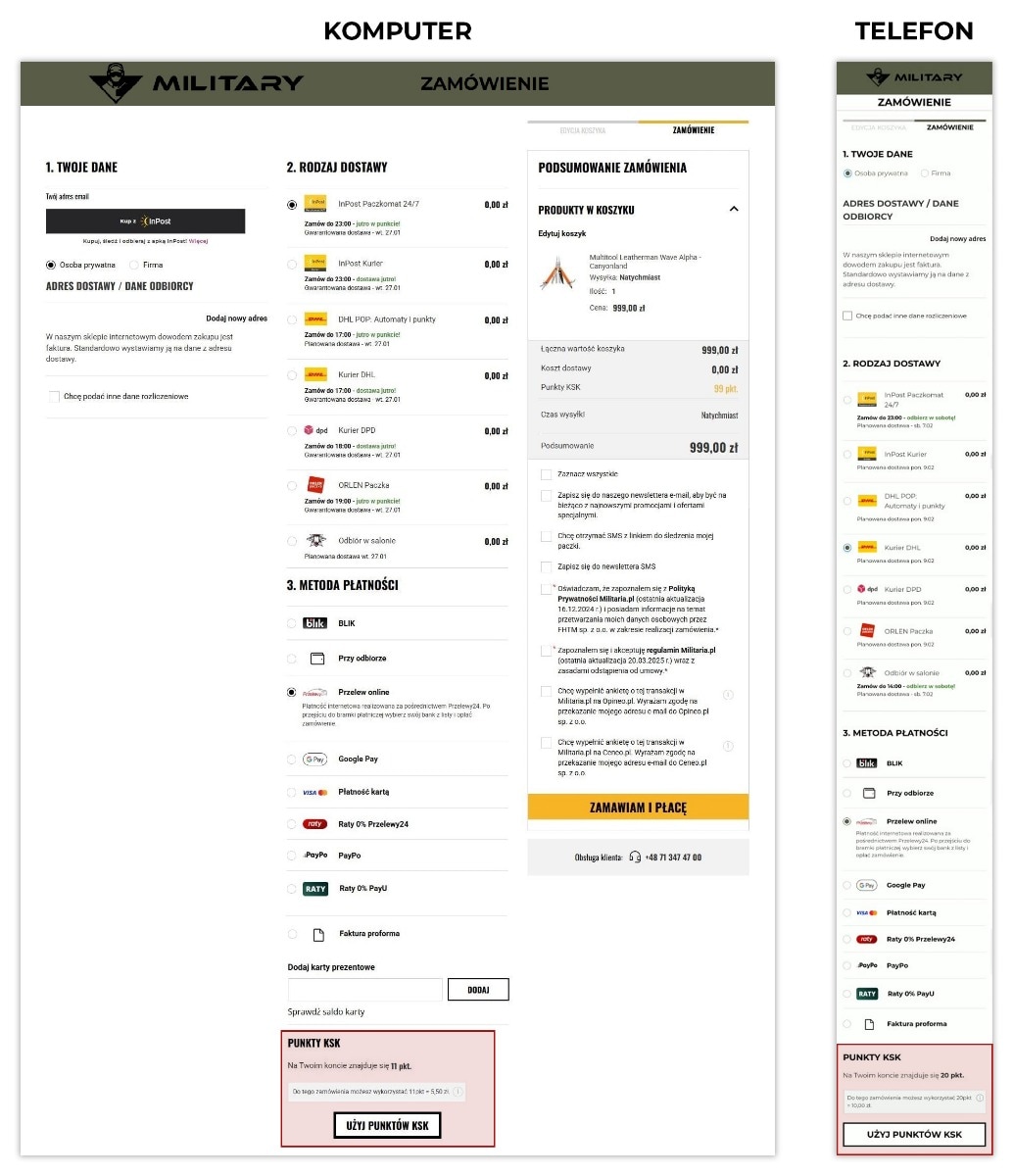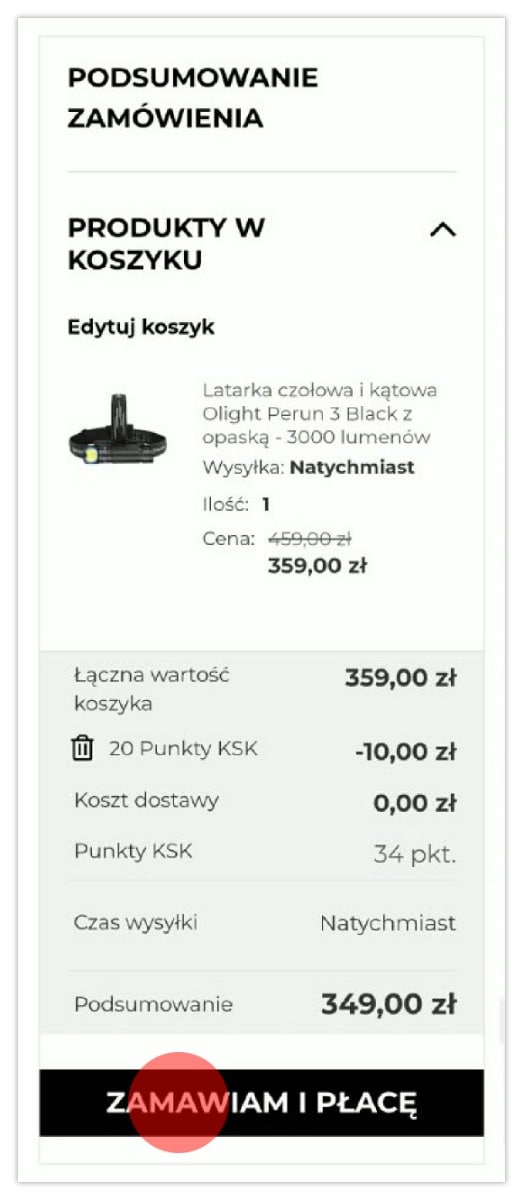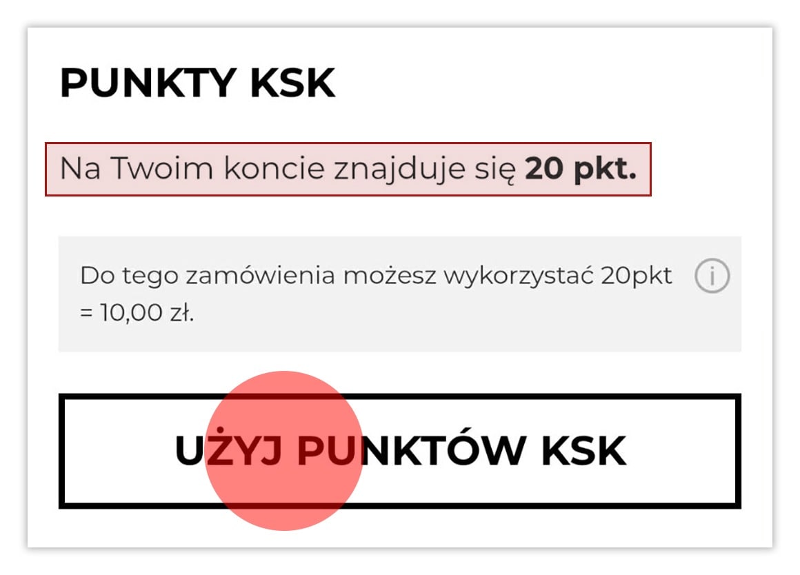 - Aby obniżyć wartość zamówienia, kliknij przycisk UŻYJ PUNKTÓW KSK. Po kliknięciu strona automatycznie się odświeży.