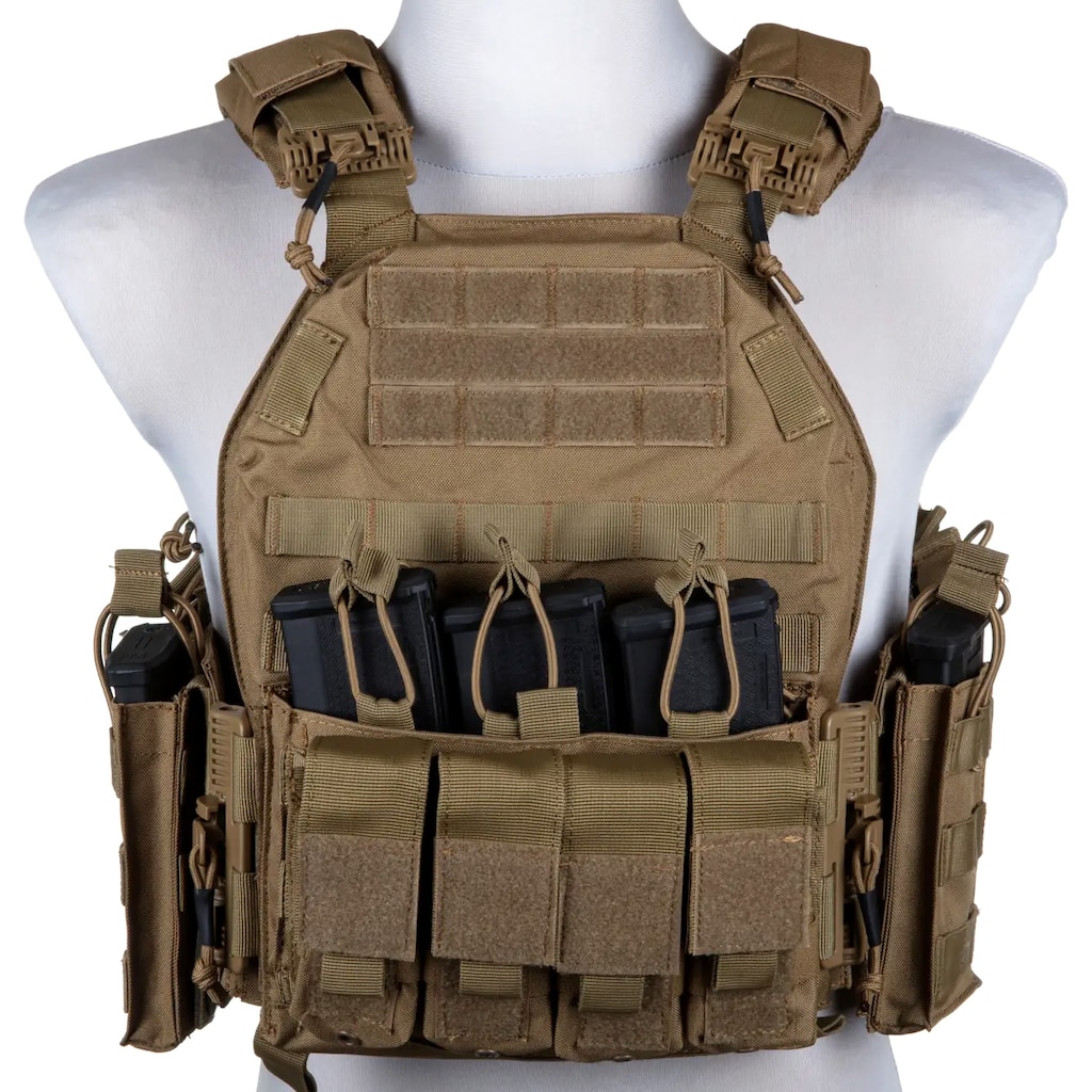 Taktyczna kamizelka typu Plate Carrier stworzona z trwałego nylonu 500D, zawiera przedni i tylny panel przystosowany do wkładów balistycznych w standardzie SAPI o rozmiarze S/M. Nadaje się do zastosowania w wojsku i służbach mundurowych, a także przez doświadczonych graczy ASG.