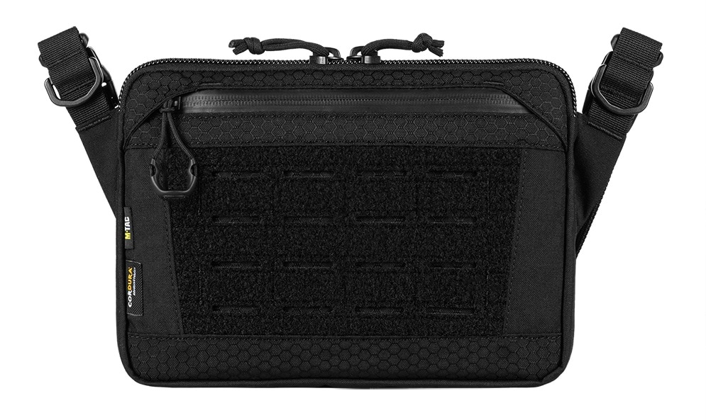 Czarna torba przeznaczona do noszenia na ramieniu. Dzięki płaskiemu profilowi i dopasowanemu kształtowi przylega do ciała, co umożliwia swobodne manewrowanie oraz łatwy dostęp do zawartości. Pozwala na użytkowanie w miejskich i terenowych warunkach. Model ma solidne zamki błyskawiczne YKK i wytrzymałe zapięcia Woojin Plastic.