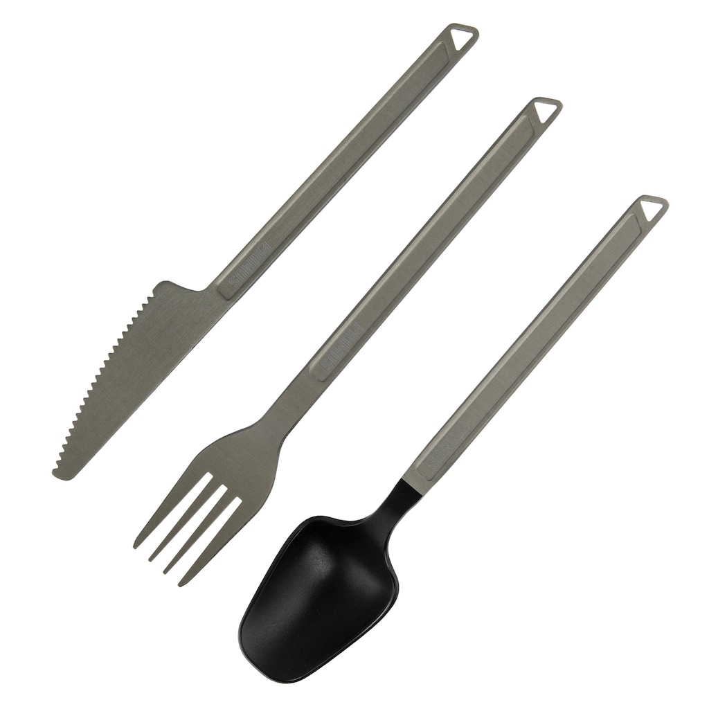Lekkie, kompaktowe sztućce wykonane z anodyzowanego aluminium o niskiej wadze. Zestaw zawiera nóż, widelec oraz łyżkę. Dzięki zastosowanej powłoce ceramicznej na łyżce, smak pozostaje neutralny, a czyszczenie staje się łatwiejsze. Silikonowy uchwyt ułatwia przechowywanie, a niewielka waga usprawnia przenoszenie całego kompletu.