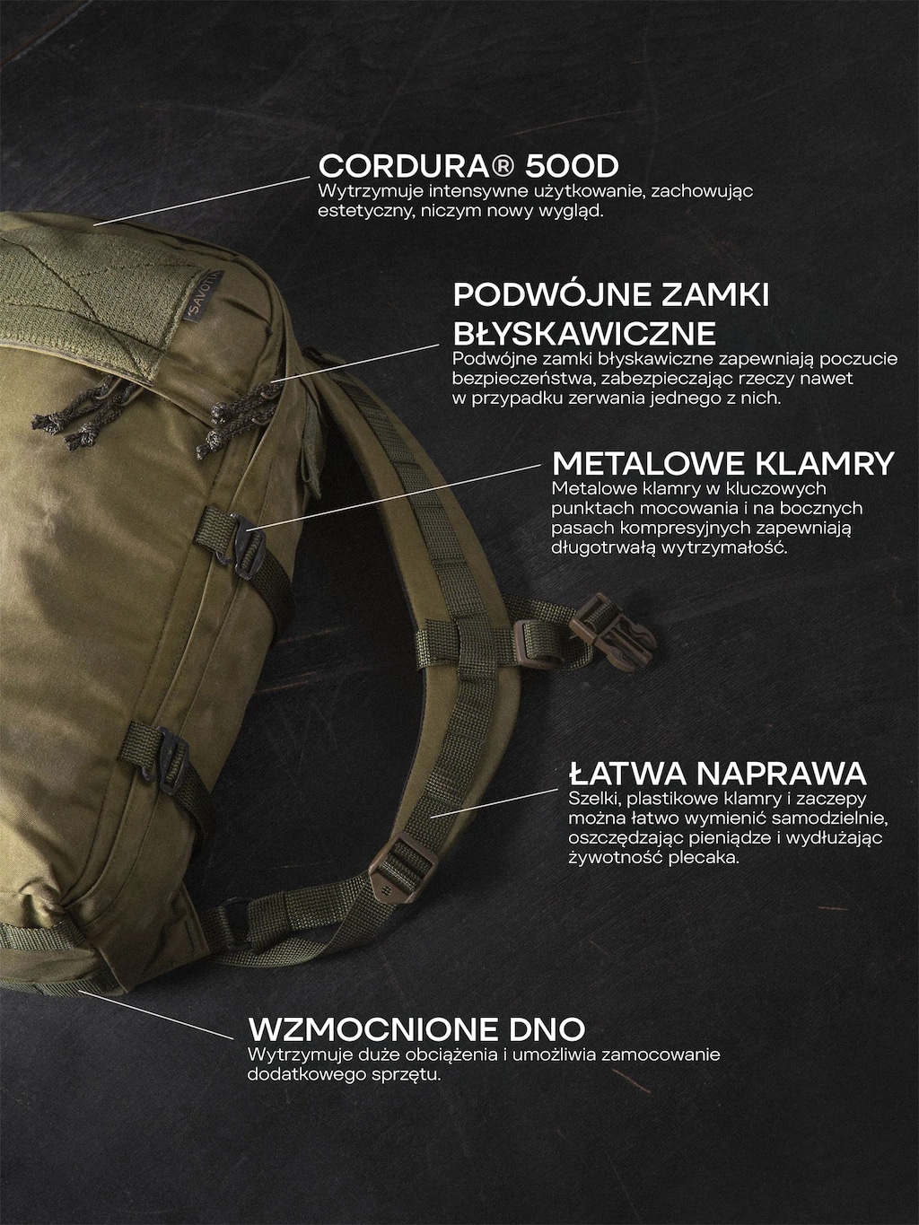 Wykonany z trwałej na przetarcia i uszkodzenia Cordury 500D, co gwarantuje dużą żywotność w trudnych sytuacjach. Materiał jest wysoce odporny na uszkodzenia mechaniczne i działanie wilgoci.