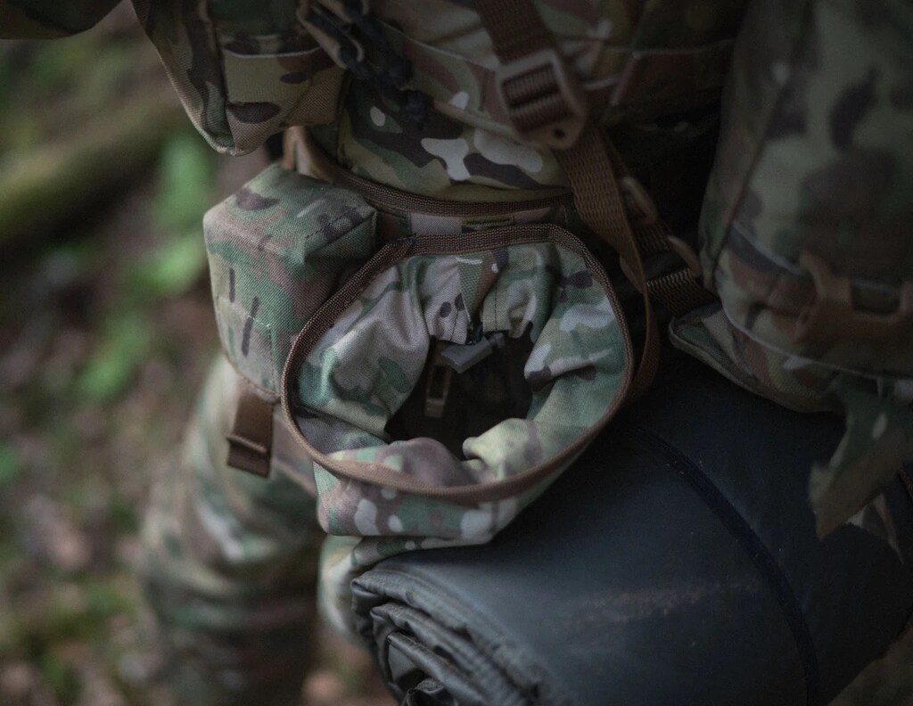 Tylna ścianka worka jest zgodna z systemem MOLLE/PALS, umożliwiając stabilne zamocowanie do pasa (o szerokości 45-50 mm), plecaka lub innych elementów oporządzenia. Umieszczony w dolnej części otwór drenażowy zapewnia szybkie odprowadzanie wody i zanieczyszczeń.